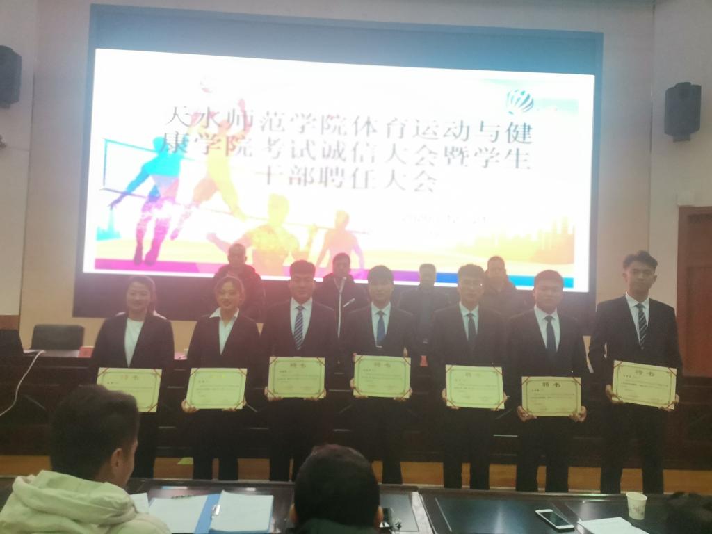 12月21日晚,体育学院在二号报告厅召开考试诚信教育大会暨学生干部聘任大会,学院党政领导班子,各教学系(部)主任,辅导员,19级、20级各班班主任,20级全体学生,以及19级、18级、17级各班学生代表共计370多人参加。大会由学院团委书记王昊支持。