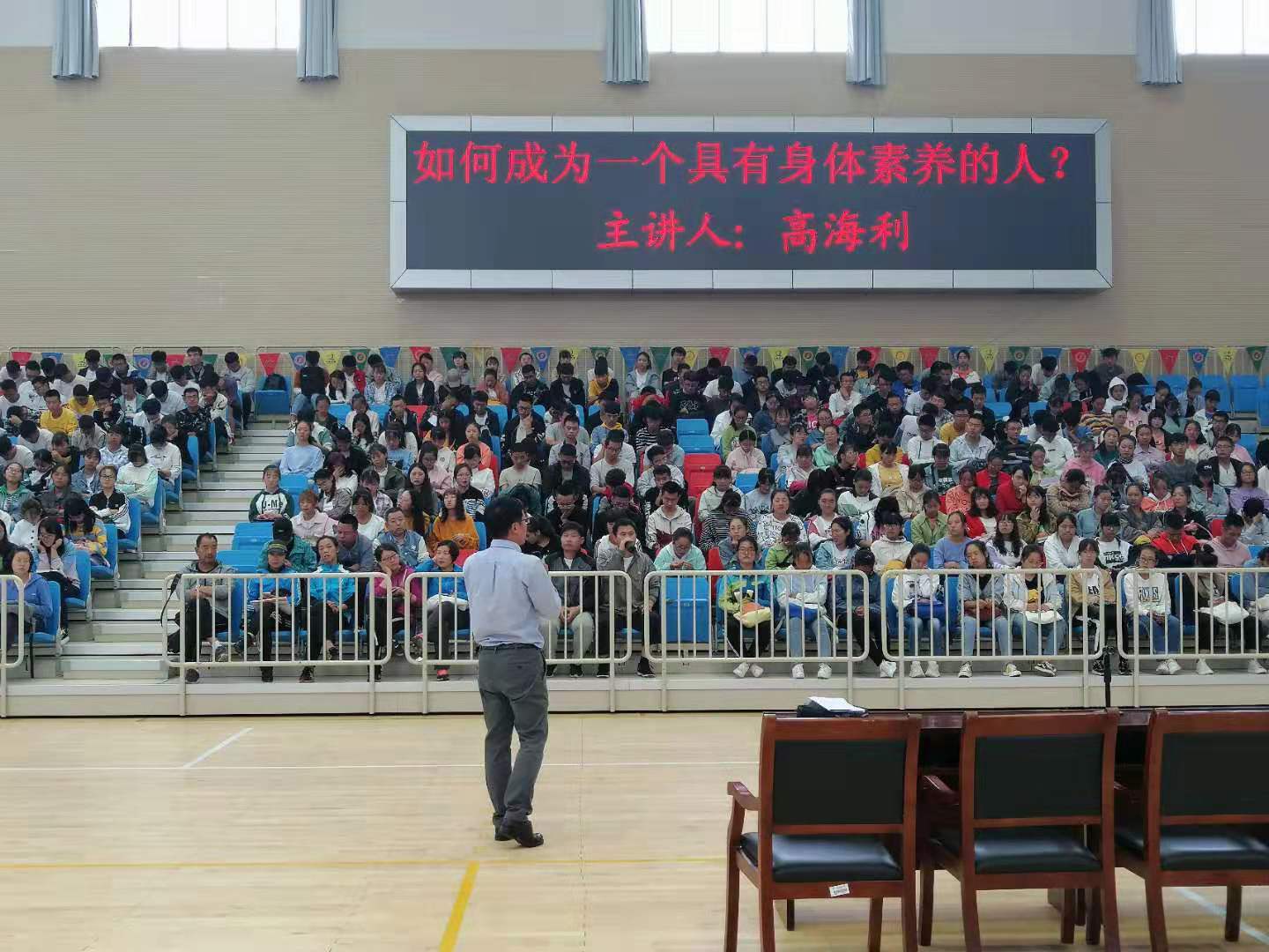 活动现场,高海利副教授做了题为“如何成为一个具有身体素养的人?”的专题讲座。高老师从身体素养理论产生的现实背景、内涵及构成要素,结合当今大学生体育活动状况进行讲解,引导学生如何培养自身身体素养。他倡议今年会2019级学生要“重视身体、关注自我健康;放下手机、远离网游;掌握一到两项的体育活动技能;少坐多动,养成参与身体活动锻炼的生活习惯;将身体素养的培养与发展视为一种旅行,一个属于自己的旅行,一生皆要亲历、体验的旅行,永远在路上!”