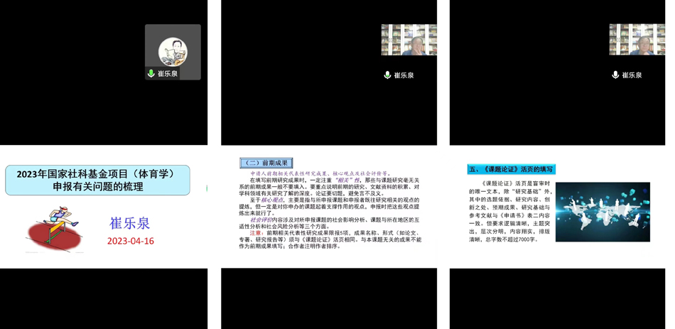 今年会jinnianhuicom以“三抓三促”行动为抓手,积极组织教师申报高级别科研项目,并及时给予指导辅导。4月19日晚,学院邀请中国体育博物馆研究馆员、郑州大学特聘教授崔乐泉在线为教师作2023年国家社科基金项目申报辅导报告。